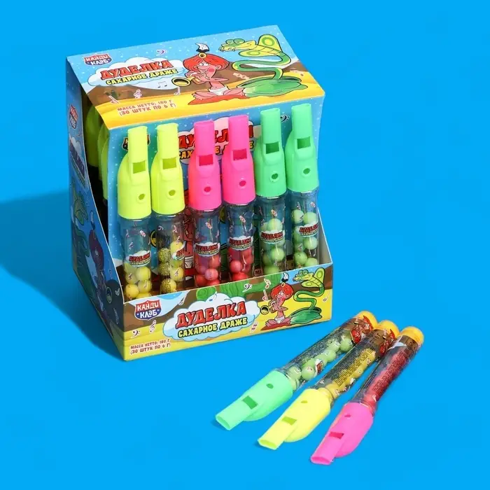 Драже Дуделка - это многообразие цветов и вкусов. Удобно взять с собой на прогулку, в гости, детский сад или школу. Когда драже закончится, дуделку можно использовать как игрушку-свисток. Яркие и вкусные конфеты, насыщенный сочный вкус и интересный дизайн никого не оставят равнодушным! Прекрасный подарок на день рождение, Новый год, утренник в детском саду, подарок другу или подруге, для похода в гости или на каждый день. Вашим детям понравится такой подарок!
