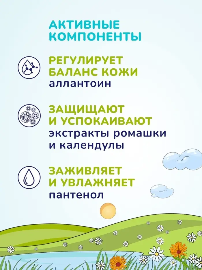 Масло персика смягчает и питает кожу. Экстракты ромашки и календулы оказывают антибактериальный эффект. Пантенол и аллантоин успокаивают раздраженную кожу и способствуют поддержанию естественного pH-баланса.