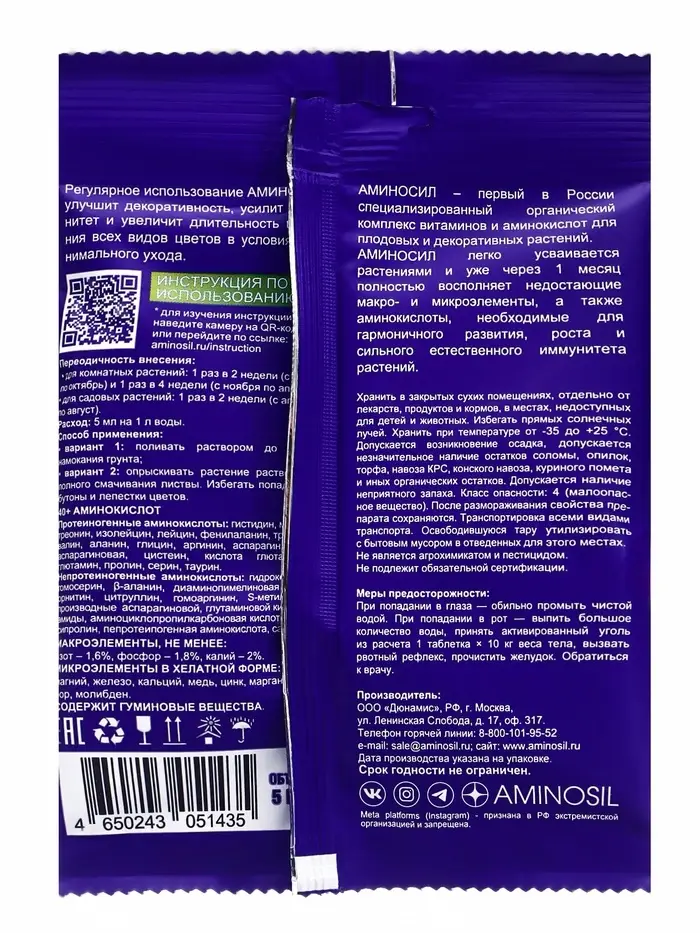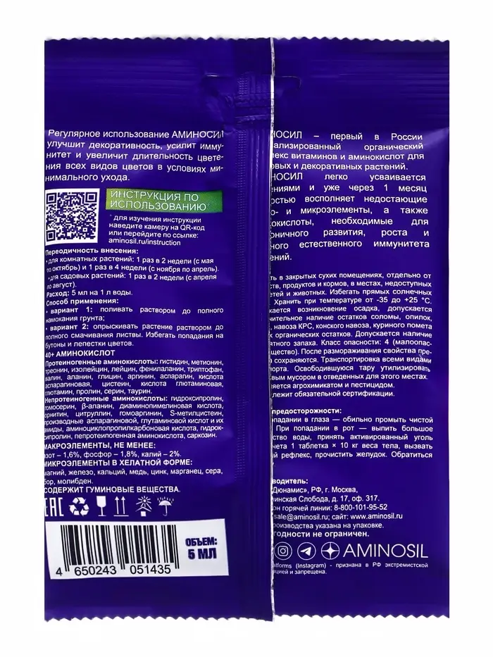 Витамины Аминосил для комнатных цветов это специально разработанный комплексный продукт, который способен обеспечить все необходимые элементы питания для здорового и красивого роста самых разных комнатных растений. Удобрение содержит все важные макро и микроэлементы, которые способны улучшить здоровье и красоту, а также ингредиенты, которые способствуют более интенсивному и длительному цветению. Поможет укрепить корневую систему и улучшить общее состояние растений. Макро и микроэлементы. 40+ аминокислот. Рекомендуется использовать в течение всего периода роста и цветения. Это позволяет достичь максимального результата и обеспечить вашим комнатным растениям все необходимые элементы питания. Если вы хотите обеспечить здоровый и красивый рост своих растений, то удобрение для комнатных цветов - это идеальный выбор для вас. Оно подходит для ухода за самыми разными растениями и поможет создать прекрасный оазис красоты и здоровья в вашем доме. Жидкая подкормка для домашних балконных комнатных цветов (чайная бенгальская полиантовая роза, фиалки орхидеи бегонии).5 мл витаминного концентрата Аминосил разбавить в 1 л воды до образования однородного раствора.Вариант 1: поливать почву и растение получившимся раствором ближе к основанию до полного намокания грунта.Вариант 2: опрыскивать растение получившимся раствором до полного смачивания листьев или протирать листья смоченной раствором салфеткой. Избегать попадания на бутоны и лепестки цветов.Периодичность: подкармливайте растения 1 раз в 2 недели (с мая по октябрь) и 1 раз в 4 недели (с ноября по апрель).Оптимальный набор питательных веществ для всех цветов, выращенных в комнатных условиях;Улучшает декоративность* всех видов комнатных цветов в условиях минимального ухода;Комплексный эффект 4 в1: питание, усиление иммунитета, стимуляция роста и цветения;