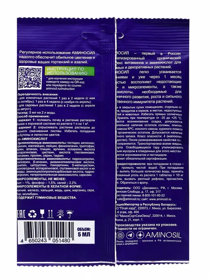 Удобрение жидкое Аминосил для гортензий и азалий, 5 мл