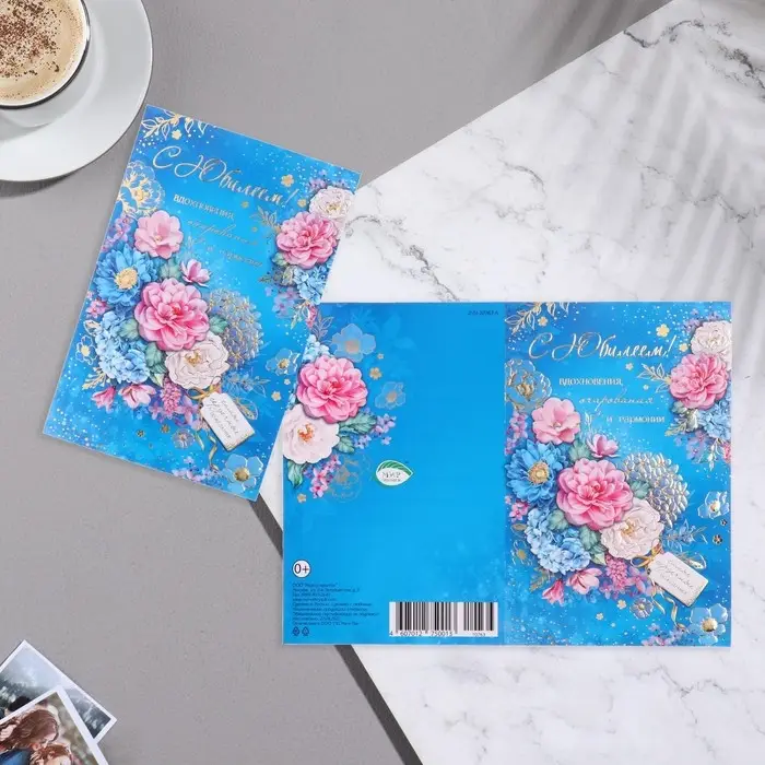 Открытка "С Юбилеем!" цветы, бирка, голубой фон, 12,5х19 см
