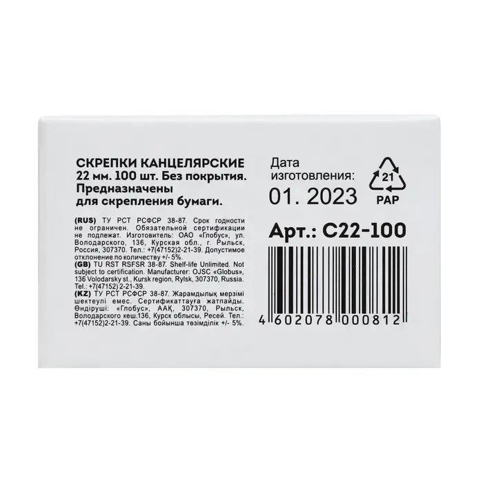 Скрепки канцелярские GLOBUS, 22 мм, 100 шт., без покрытия