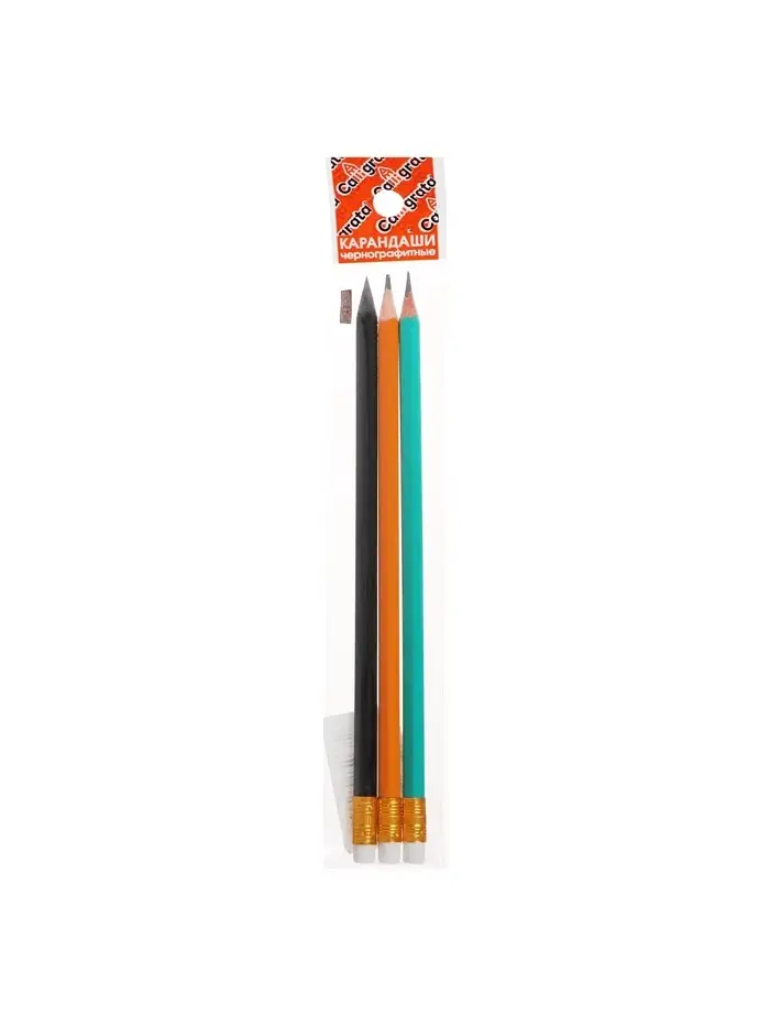 Набор карандашей чернографитных 3 штуки, HB, Calligrata, пластиковых, с ластиком, корпус микс