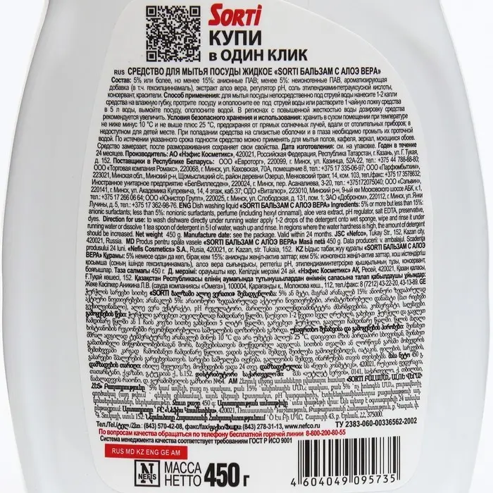 Средство для мытья посуды Sorti "Алоэ-вера", 450 мл