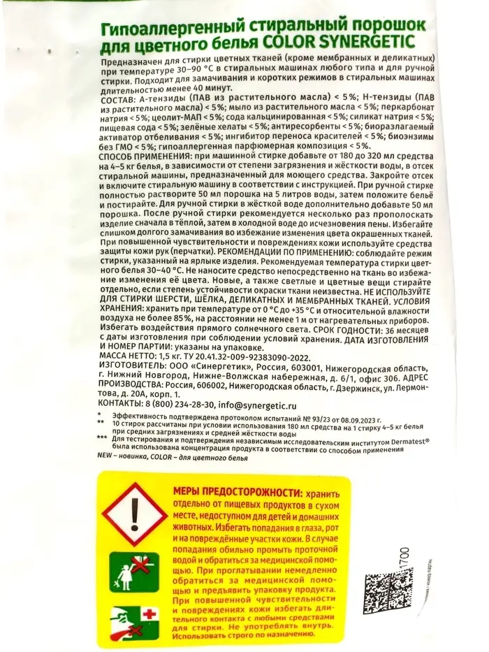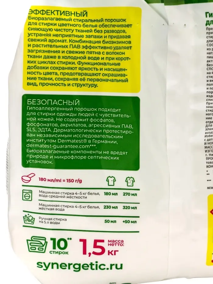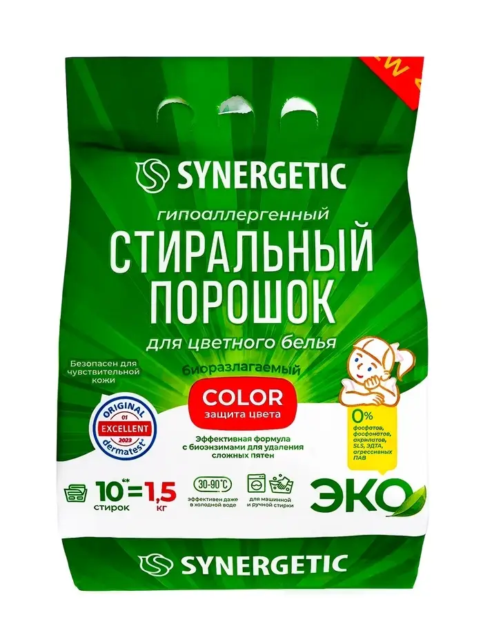Стиральный порошок Synergetic Color, гипоаллергенный, 1.5 кг
