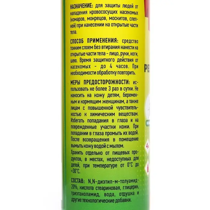 Описание:Аэрозоль (репеллентный) от комаров ARGUS предназначен для защиты людей от кровососущих насекомых (комаров, мошек, слепней, мокрецов, москитов, блох) при нанесении на открытые части тела и на одежду. Класс эффективности - высший. Время защитного действия при нанесении на кожу - более 4 часов даже при высокой численности насекомых, при нанесениии на одежду и изделия из ткани - до 20 суток.Состав: М, М-диэтилтолуамид(18%), пропиленгликоль, отдушка, углеводородный пропеллент, спирт изопропиловыйСпособ применения: средство тонким слоем без втирания нанести на открытые части тела - лицо, руки, ноги, шею. Время защитного действия от насекомых - до 4 часов. При необходимости повторить.