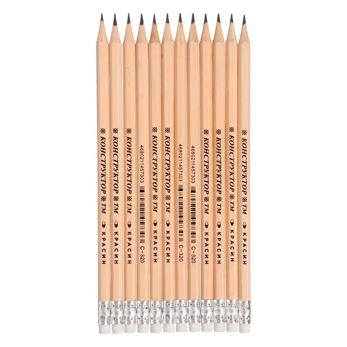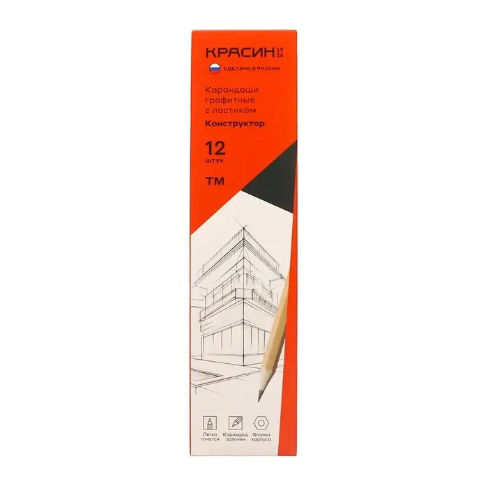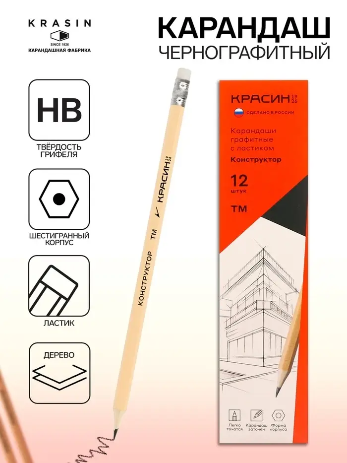 Карандаш чернографитный Красин «Конструктор» HB шестигранный, заточенный, с ластиком