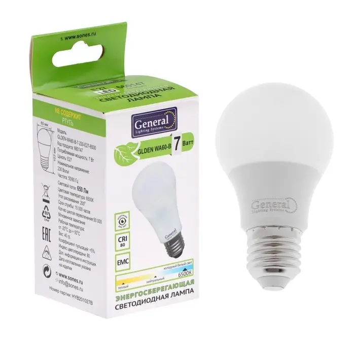 Лампа светодиодная GENERAL GLDEN, WA60, E27, 7 Вт, 230 В, 6500 К