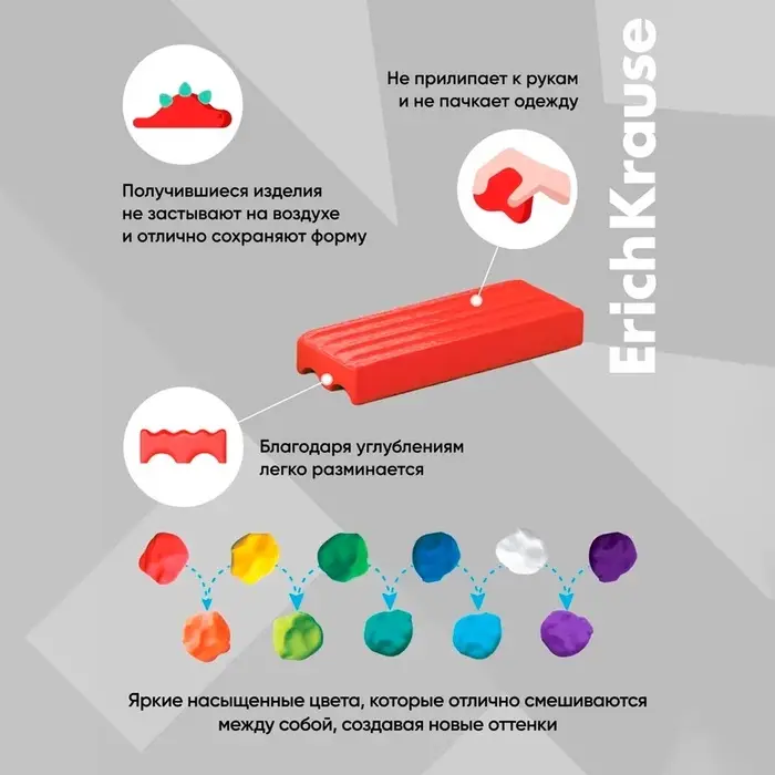 Классический пластилин ErichKrause - серия, созданная специально для детей школьного возраста 7-12 лет. Обновленная формула пластилина с улучшенной мягкостью не крошится и не рвется при разминании, не липнет к рукам и не оставляет жирных пятен. Готовая поделка хорошо сохраняет свою форму и не застывает на воздухе.