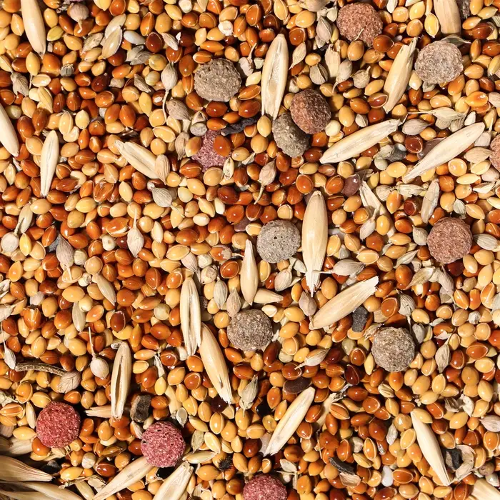 Просо желтое, просо красное, просо белое, чумиза, овсянка, семя конопли, семя льна, канареечное семя, семя суданки, рапс, морская капуста, кунжут, овес, витамины A, D3, E, B, комплекс минералов.
