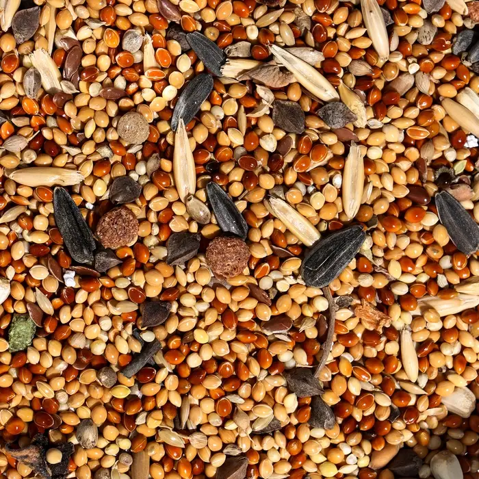 Состав: просо красное, просо черное, просо желтое, овес, семена подсолнуха, орехи молотые ( грецкий арахис), конопляное семя, льняное семя, сушеная морковь, семена сафлора, гречиха, канареечное семя, сушеные яблоки, рябина сушеная, сорго, овсянка, пшеница, семена луговых трав, морские водоросли.