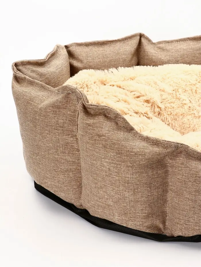 - Два слоя комфорта: Внешняя часть из мебельной рогожки выдерживает активное поведение питомца, а внутренняя зона из искусственного меха создает ощущение тепла и уюта даже в прохладное время года.