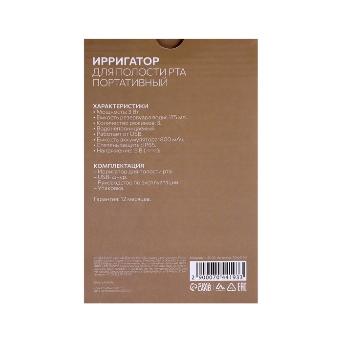 Ирригатор для полости рта Luazon LIR-01, портативный, 175 мл, 3 режима, 2 насадки, от USB