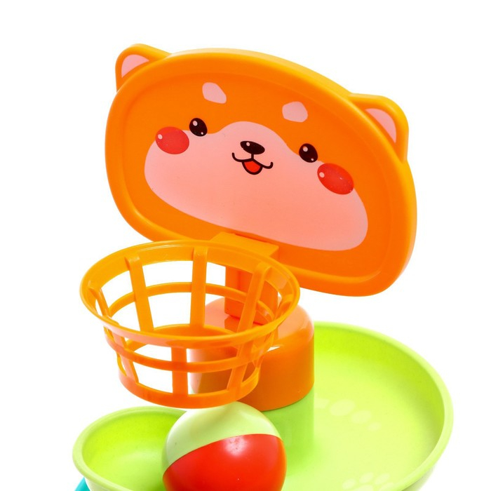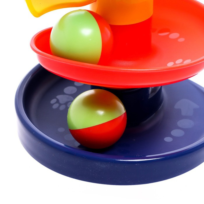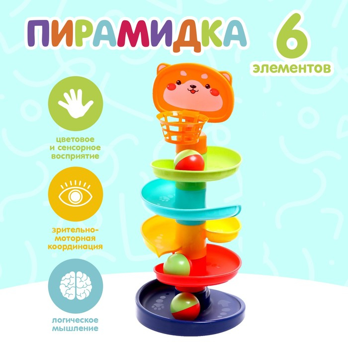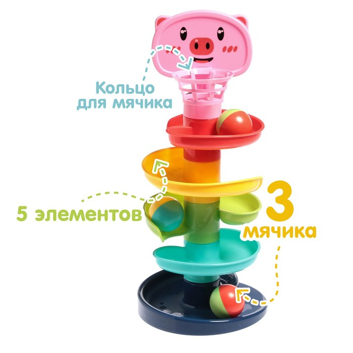 Малыш будет бросать разноцветные шарики в корзинку, и следить, как они скатываются с горки по спирали.