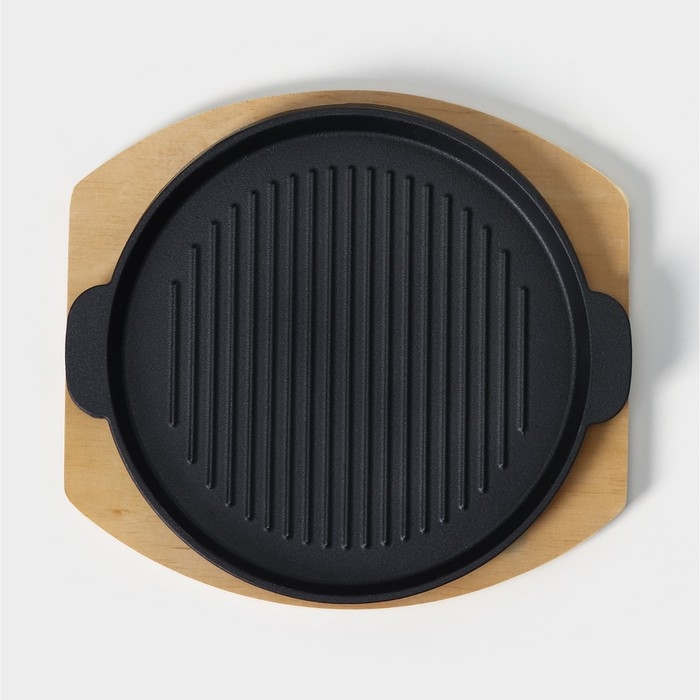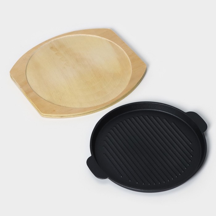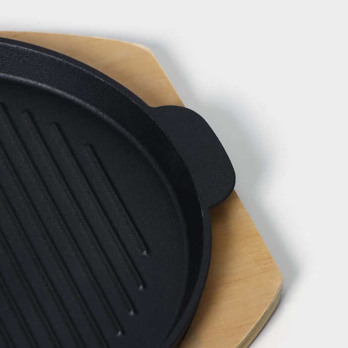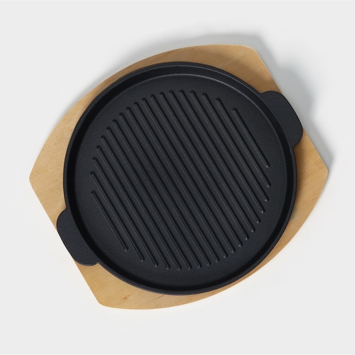Сковорода чугунная на деревянной подставке «Круг. Гриль», 27,3×24 см, цвет чёрный