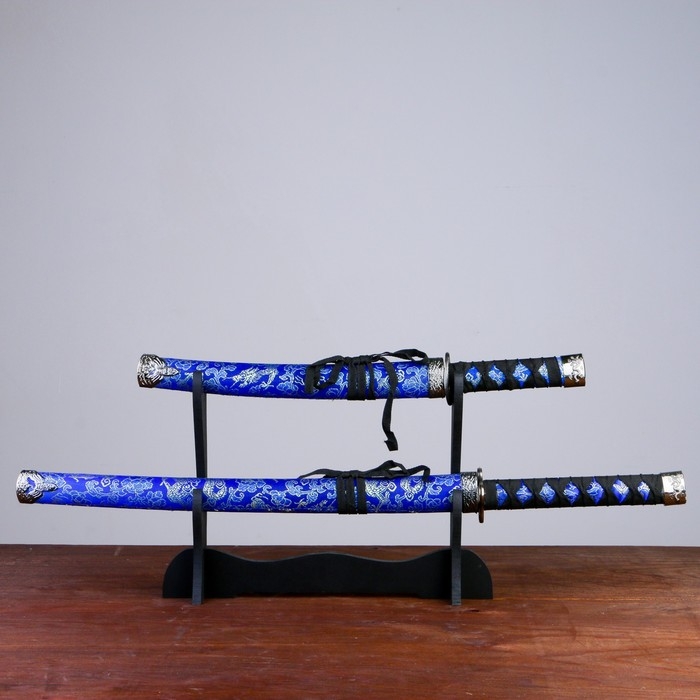 Сув. изделие катаны 2в1 на подставке, ножны ткань, драконы золото на синем 47/70см