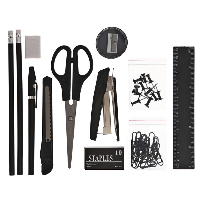 Настольный набор-органайзер, 13 предметов (шариковая ручка - 1 шт., карандаш с ластиком - 2 шт., ножницы, нож, линейка, точилка, степлер №10, скобы №10 - 500 шт., скрепки, кнопки-гвоздики, ластик, подставка), черный, вращающийся на 360 градусов.