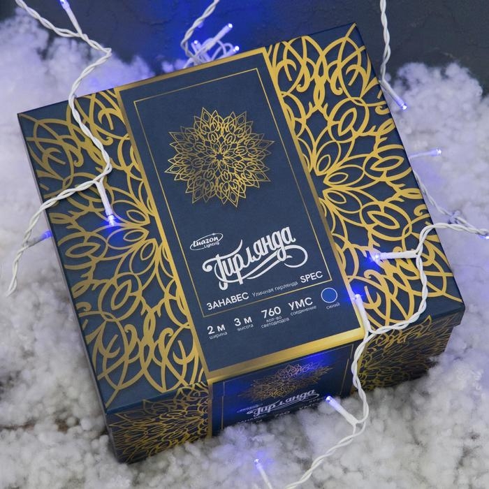 Гирлянда «Занавес» 2 × 3 м, IP44, УМС, белая нить, 760 LED, свечение синее, 220 В