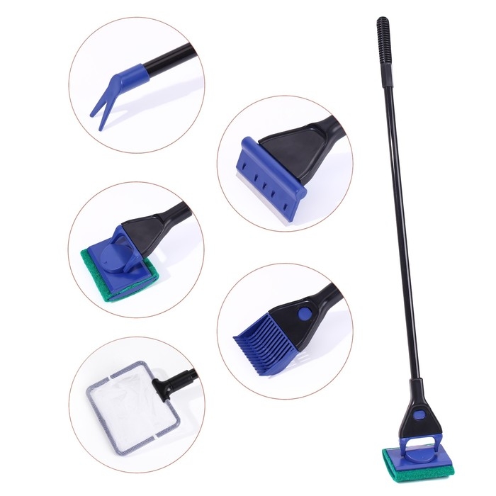 Набор инструментов для ухода за аквариумом включает в себя два скребка (мягкий и металлическое лезвие), сачок, насадки для грунта и растений, которые могут меняться на едином держателе по мере необходимости. Может иcпользоваться в пресной и соленой воде.