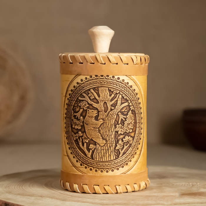 Пластичность и лёгкость бересты позволяет мастерам создавать витиеватые узоры и мелкие детали, поэтому берестяная посуда украшает интерьер.
