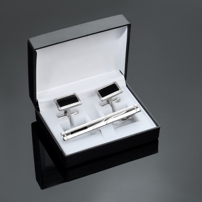 Набор мужской «Запонки + Зажим для галстука» прямоугольник с эмалью, цвет чёрно-серебристый