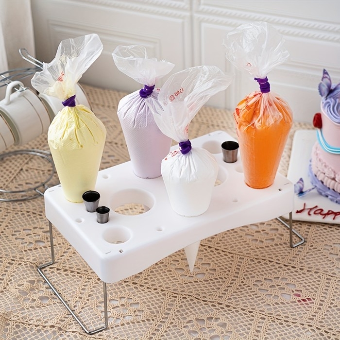 Специальная подставка сделает хранение кондитерских мешков и гвоздей удобным и поможет защитить кухонные поверхности от попадания крема, мастики и муки.