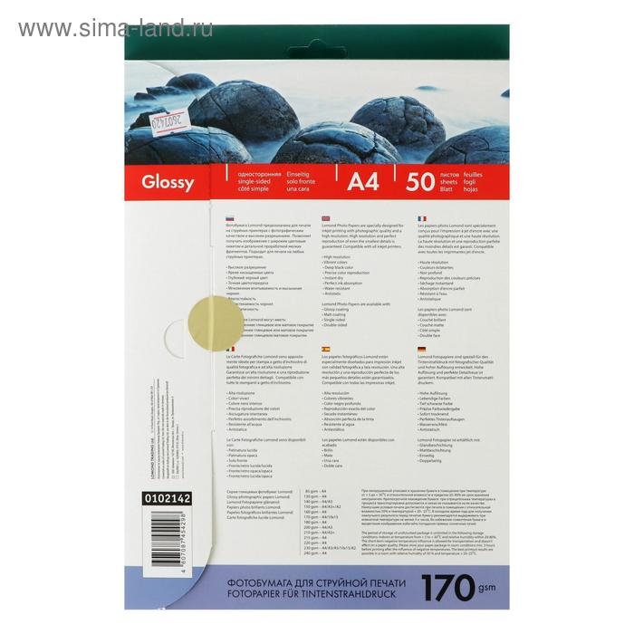 Фотобумага для струйной печати А4, 50 листов LOMOND, 170 г/м2, односторонняя, глянцевая