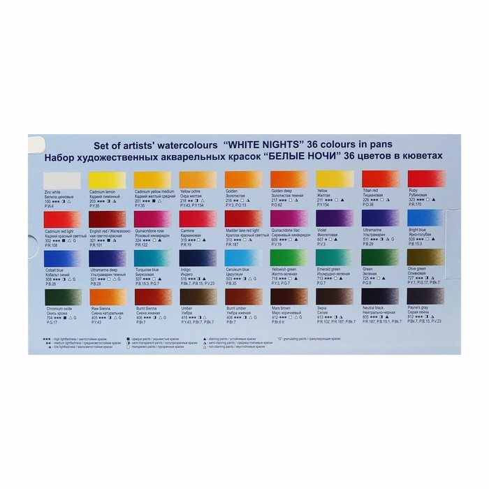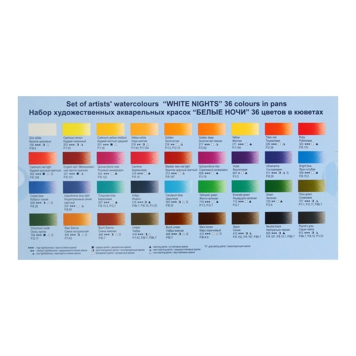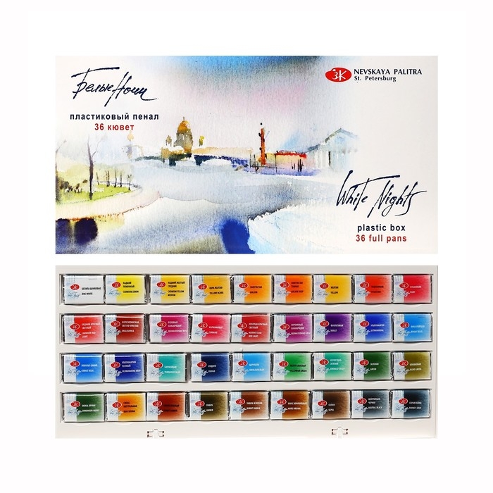 Профессиональные художественных акварельные краски "Белые ночи" представляют собой тонкодисперсные суспензии пигментов и наполнителей в связующем, в состав которого входит водный раствор растительного клея – гуммиарабика. Высокая концентрация пигмента обеспечивают максимальную интенсивность цветового тона акварели. Насыщенность сохраняется даже при разбавлении большим количеством воды. Отличаются прозрачностью, что дает возможность художнику работать тонкими лессировками. Чистые цвета позволяют писать в смесях и получать богатое многообразие оттенков. Основная часть красок обладает высочайшим показателем светостойкости, что способствует сохранности работ свыше 100 лет. Все это обеспечивает их высокое качество и возможность использования в ответственных работах. Палитра набора "Белые ночи" из 36 цветов наиболее полно раскрывает потенциал живописных приемов и техник акварели. Набор представлен в пластиковом пенале со съемной палитрой.