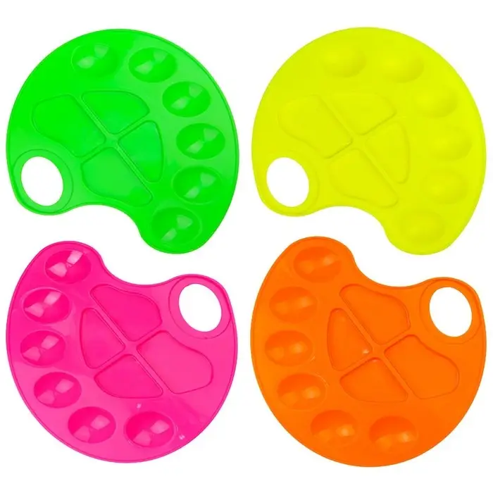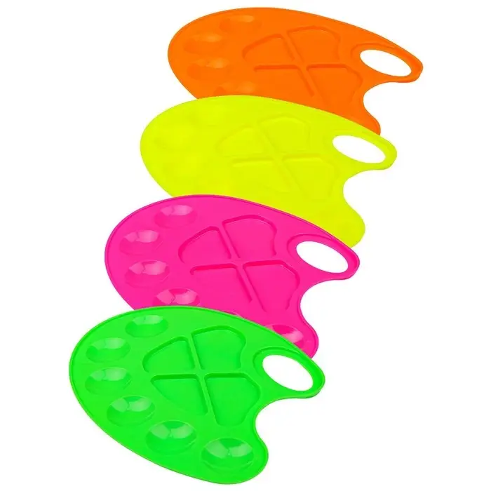 Палитра художника Calligrata овальной формы – отличный инструмент для смешивания красок и получения новых цветов. Она представлена в размере 23,2 х 16,9 мм и имеет 10 ячеек. Ассорти из 4 неоновых: салатовый, лимонный, морковный. фуксия. Легкая и практичная, имеет отверстие для руки удобного хвата. Палитра для рисования является незаменимым атрибутом как для начинающих художников, так и для профессиональных творцов.