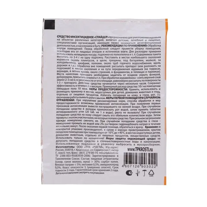 Меры предосторожности: Хранить, использовать и размещать приманку в местах, недоступных для детей, домашних животных и птиц, отдельно от пищевых продуктов. Избегать попадания на кожу, в глаза, рот. По окончании работы вымыть руки с мылом. При попадании средства на кожу -смыть большим количеством воды.