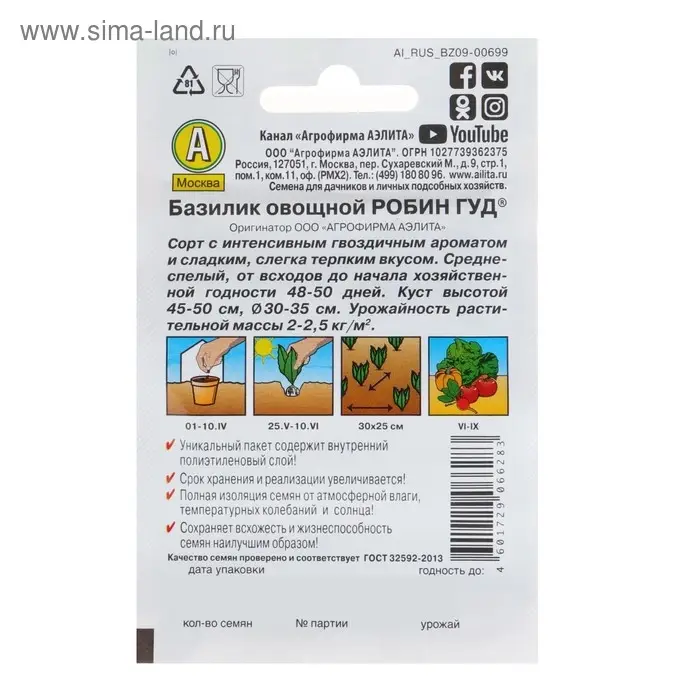 Семена Базилик овощной "Робин Гуд" "Лидер", пряность, 0,2 г ,