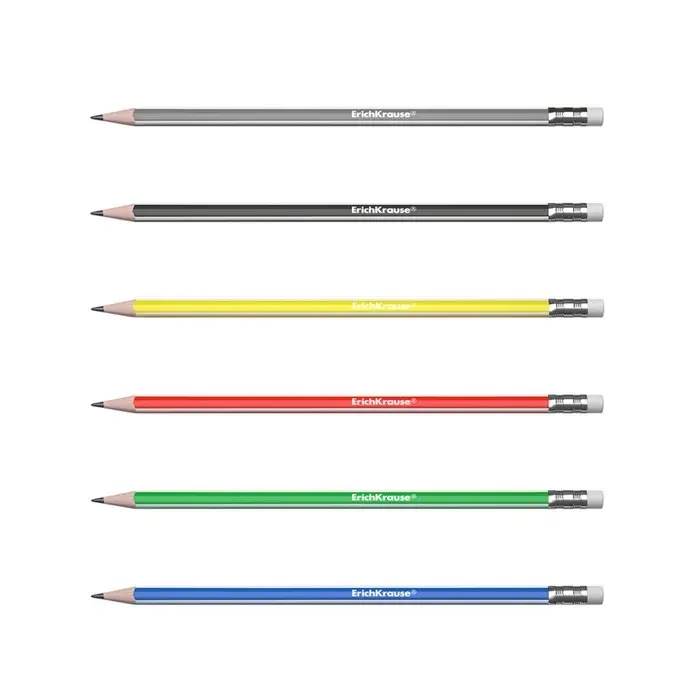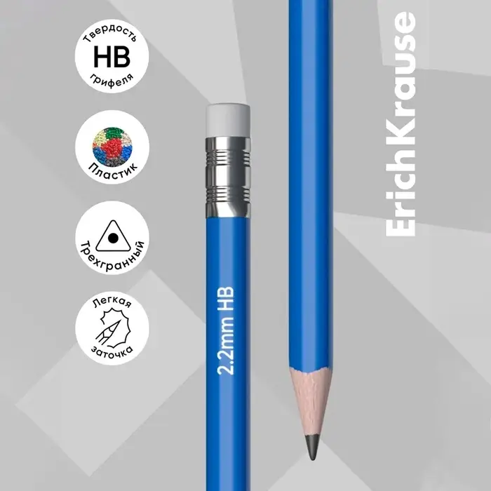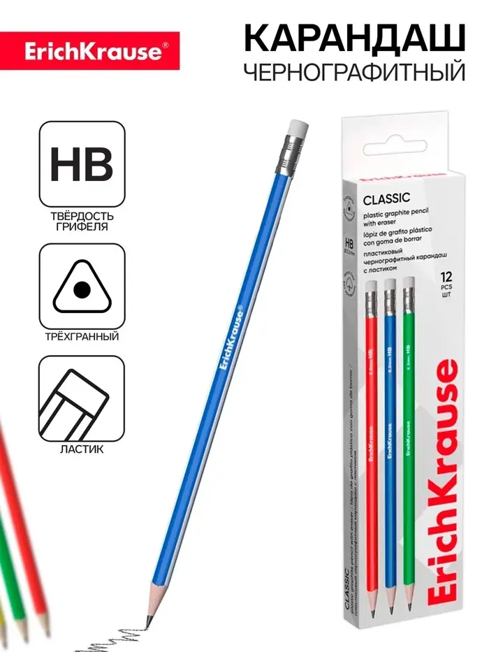 Карандаш чернографитный с ластиком ErichKrause "Classic triangle 101", HB, грифель d=2.2 мм, пластик, трёхгранный в коробке, микс