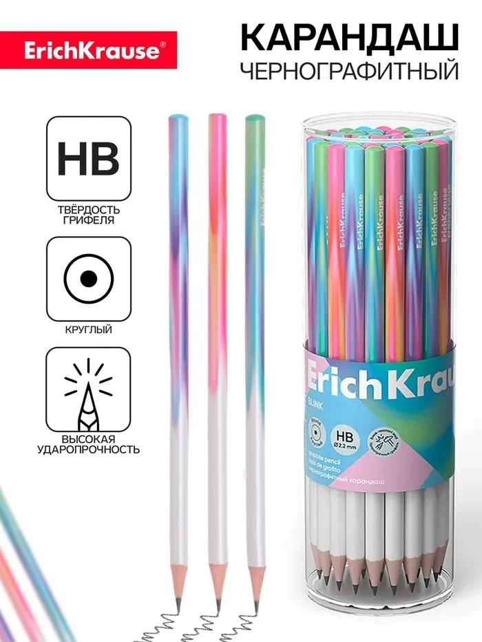Карандаш чернографитный ErichKrause "Blink", НВ, грифель d=2,2 мм, дерево, круглый, в тубусе, металлик микс