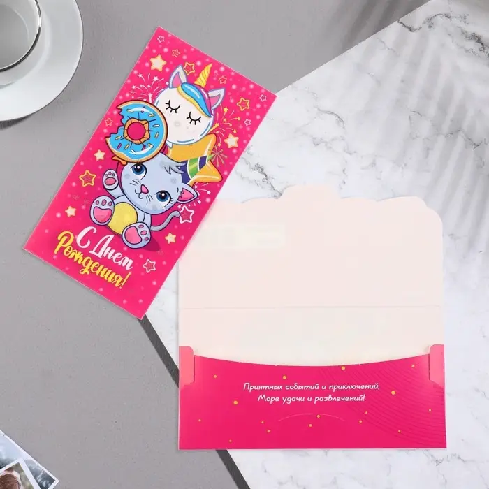 Конверт для денег "С Днем Рождения!" котенок, шарики