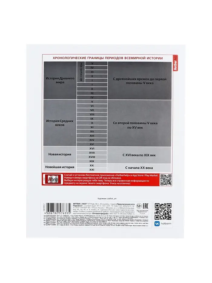 Тетрадь 48 листов в клетку «Приключения кота Пирожка» ИСТОРИЯ, обложка мелованная бумага, с интерактивным справочником, блок офсет