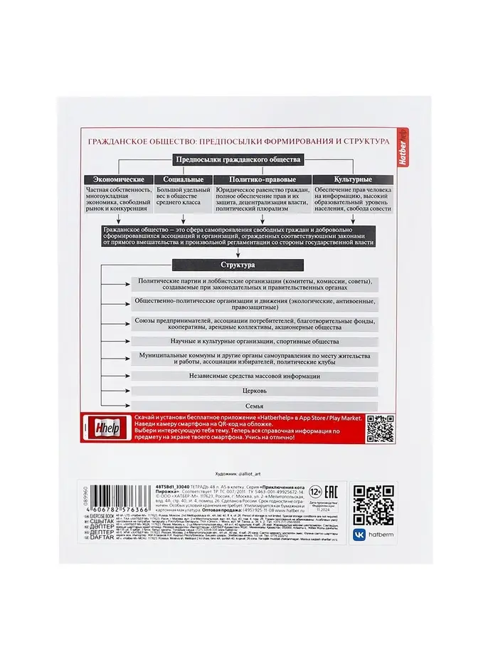 Тетрадь 48 листов в клетку «Приключения кота Пирожка» ОБЩЕСТВОЗНАНИЕ, обложка мелованная бумага, с интерактивным справочником, блок офсет