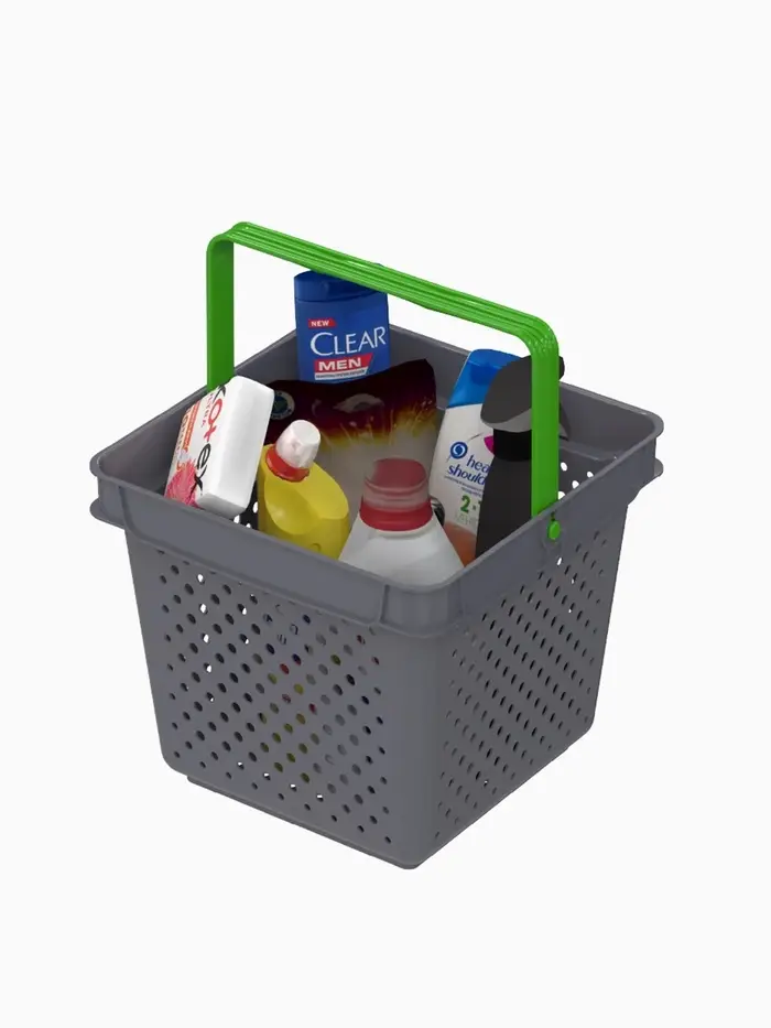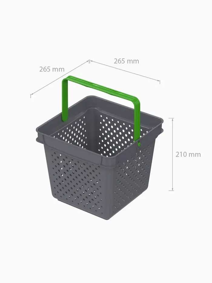 Лёгкая и компактная при вместительности до 10 кг. Удобная конструкция. Ручка салатового цвета может фиксироваться в вертикальном положении. Прочная и долговечная. Максимально устойчива к повреждениям. Функциональный дизайн и привлекательный внешний вид. Специальная перфорация для предотвращения выпадения мелких товаров.