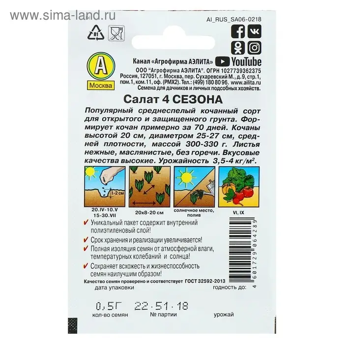 Семена Салат "4 сезона" кочанный "Лидер", 0,5 г ,