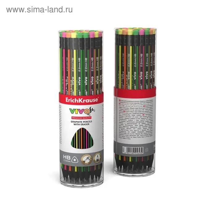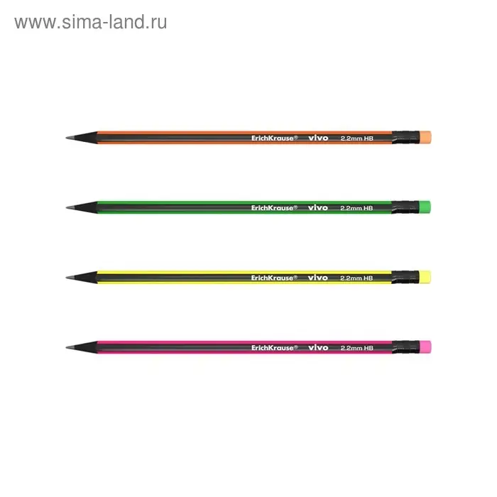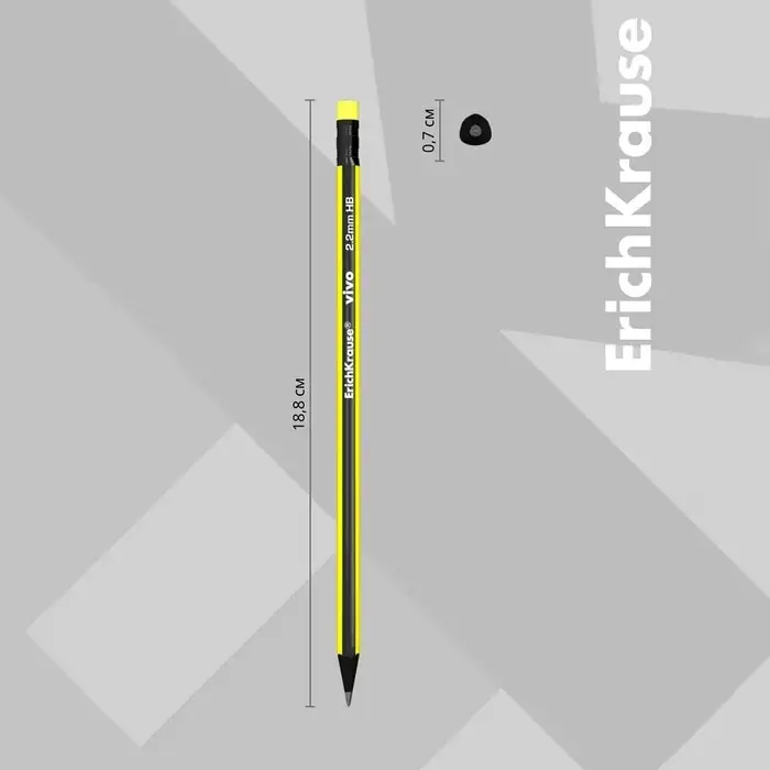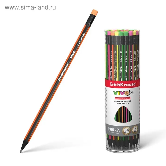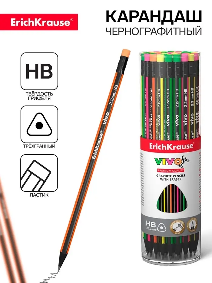 Карандаш чернографитный, ErichKrause «Vivo», HB, d=2.2 мм, с ластиком, дерево, трехгранный в тубусе, микс