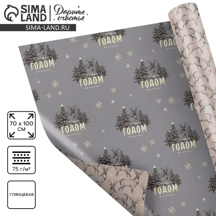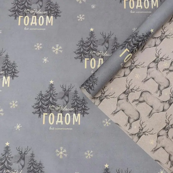 Упаковочная бумага на новый год глянцевая двусторонняя «Олени», 70 х 100 см