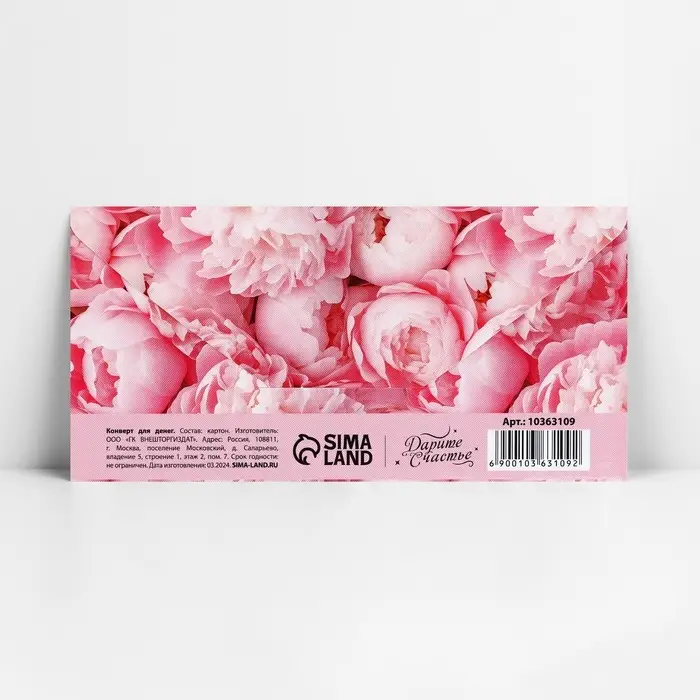 Конверт для денег «Пионы», 16.5 х 8 см