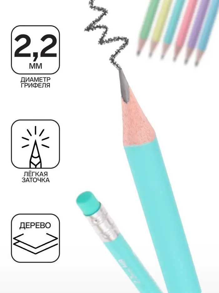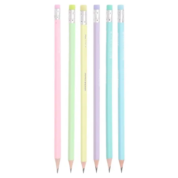 Эргономичный трехгранный чернографитный карандаш из отборной древесины с ластиком, твердость НВ. Шесть пастельных цветов корпуса, ластик в цвет корпуса. Специальная пропитка древесины и сплошная проклейка грифеля обеспечивает высокую ударопрочность. Мягкая древесина и идеальная центровка грифеля гарантируют легкую заточку с экономным расходом карандаша. Грифель диаметром 2.2 мм не царапает бумагу и не крошится. Ластик карандаша средней жесткости изготовлен из экологически чистого и гипоаллергенного материала термопластичной резины (TPR). Не содержит ПВХ. Длина 188 мм.