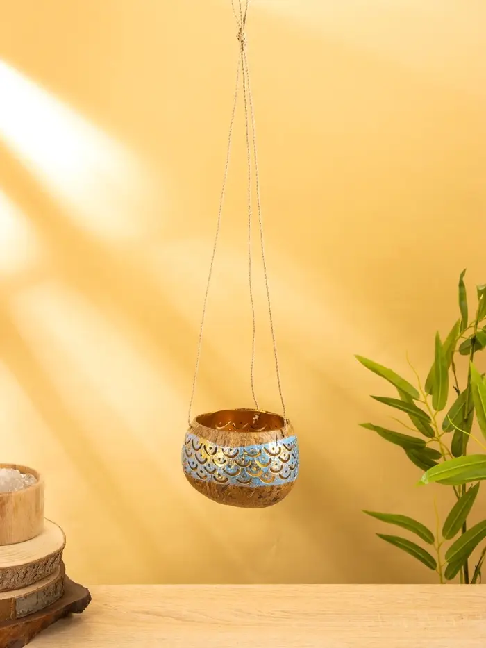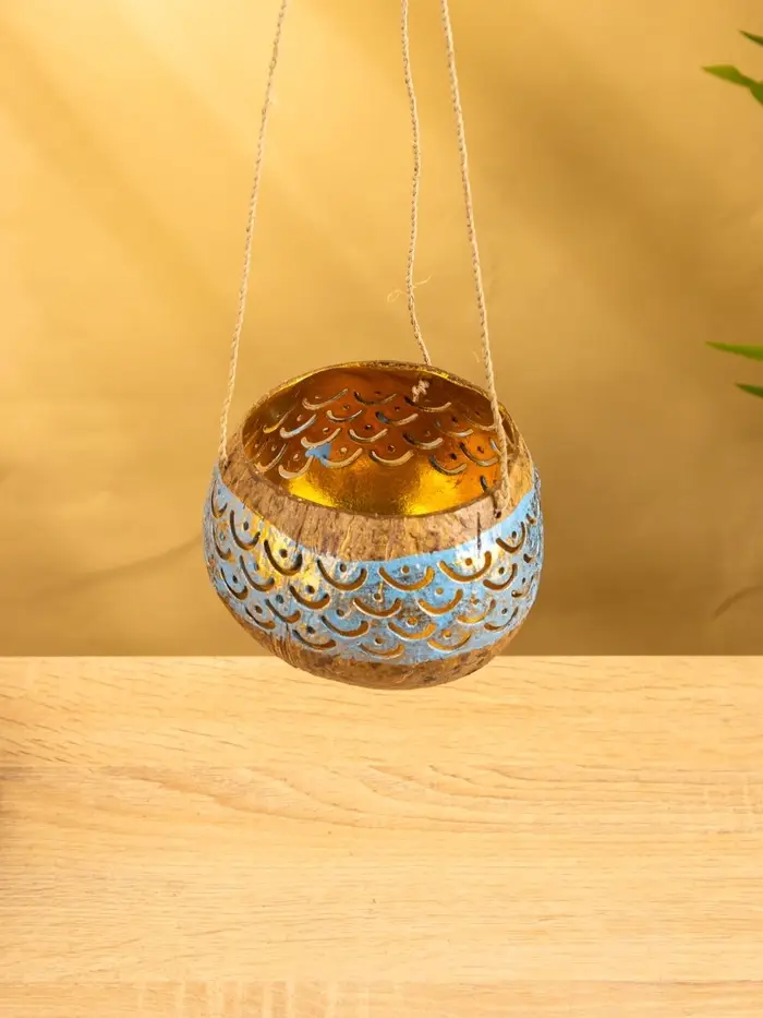 Подсвечник подвесной из кокоса, 9-12 см, золотисто-голубой