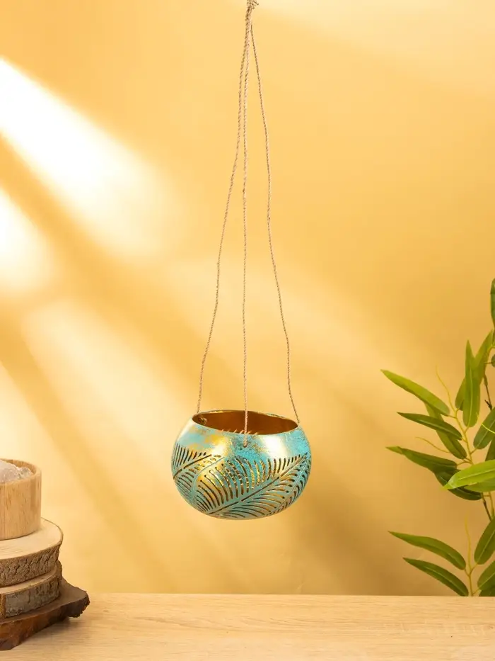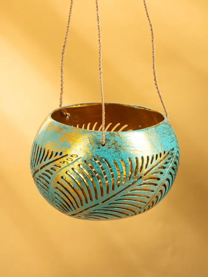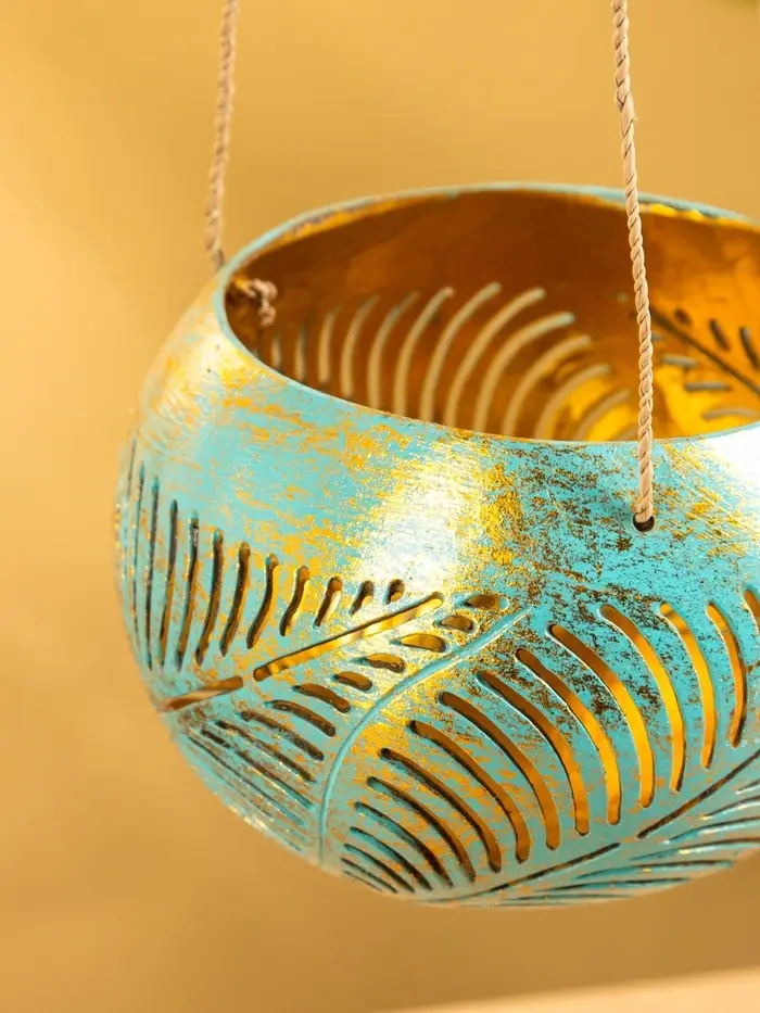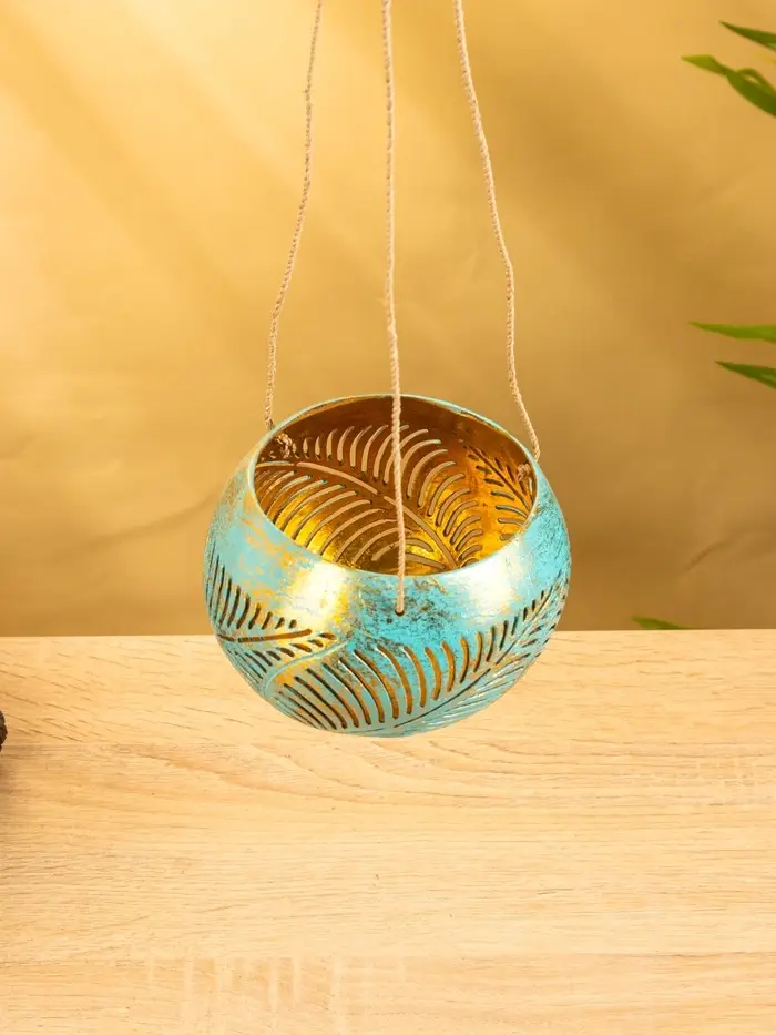 Подсвечник подвесной из кокоса, 10-13 см, бирюзово-золотой