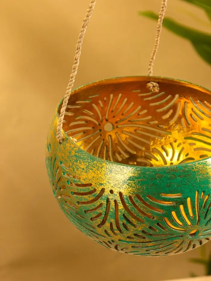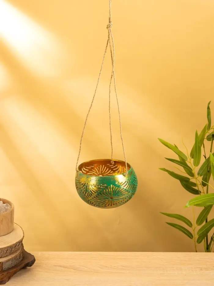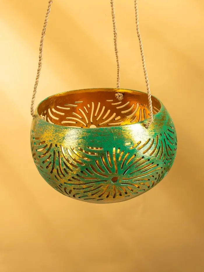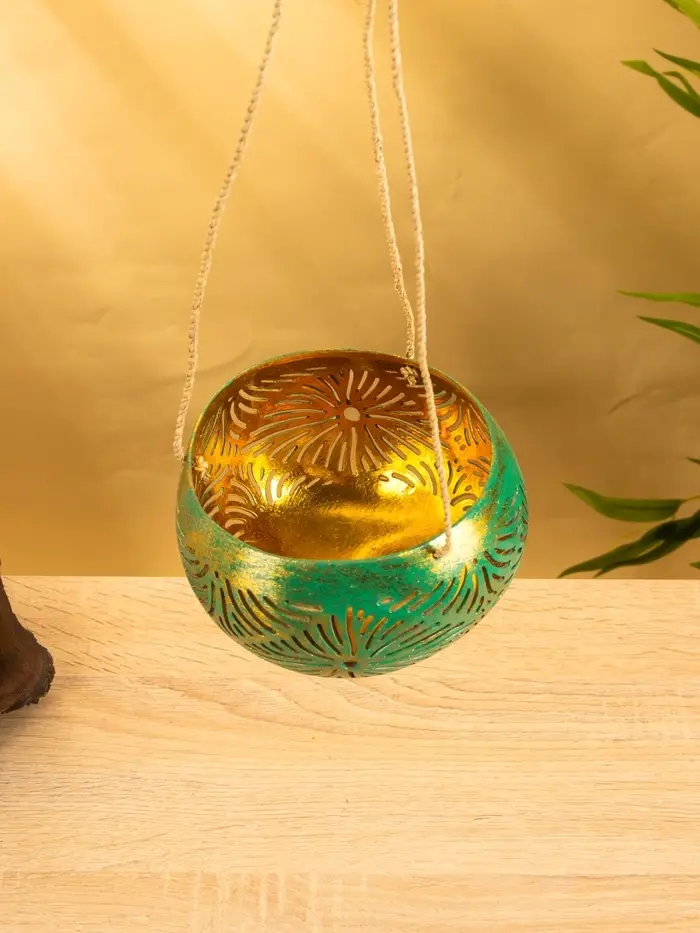 Подсвечник подвесной из кокоса, 12-14 см, тёмно зелёный-золотой
