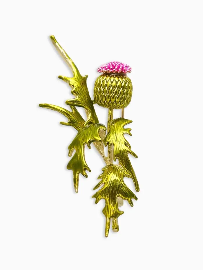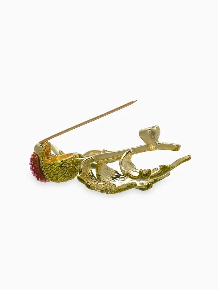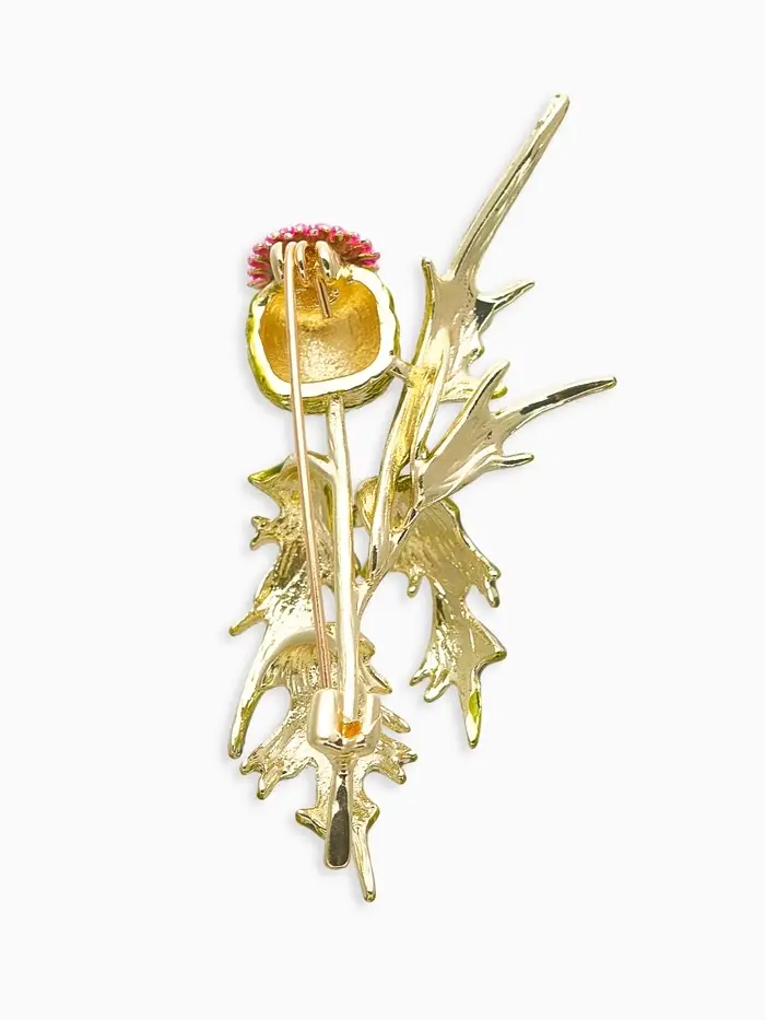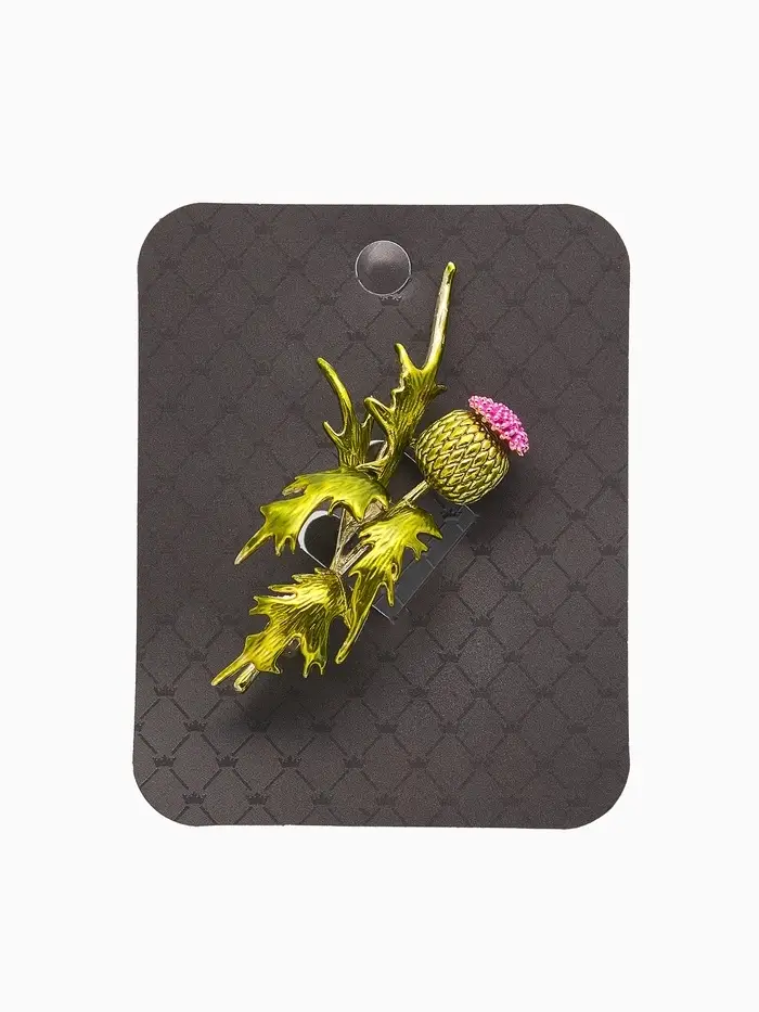 Брошь "Чертополох" растение, зелёно-розовый в золоте