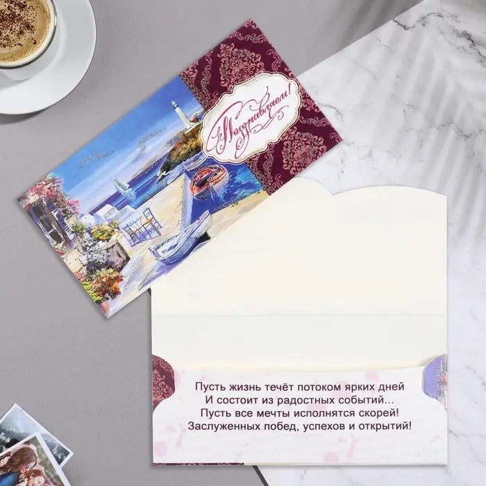 Конверт для денег "Поздравляем!" море, яхта, фиолетовый тон, 17х8,8 см