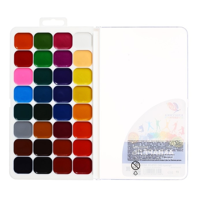 Высококачественная краска для детского творчества, изготовленная по классической рецептуре. В акварели есть мёд, что значительно улучшает её качество и внешний вид. Прекрасно размывается и разносится по поверхности бумаги, легко наполняясь на кисть. Краски смешиваются между собой, сохраняя насыщенность цвета без вкраплений. Большое количество краски в кюветах. Краска легко смывается с рук и одежды. Безопасна для детей.