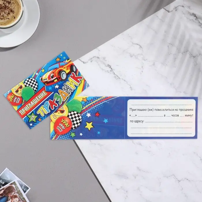 Приглашение "На праздник!" машинка, синий фон, 24,7х7,11 см