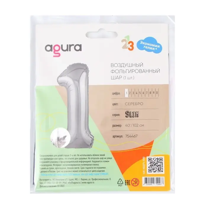 Шар фольгированный 40" «Цифра 1», цвет серебряный, Slim